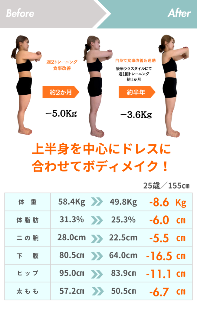 その後、ブライダル前に週1でボディメイクをしました。